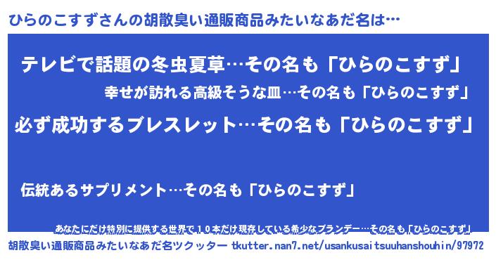| ヒーロー風カッコイイあだ名 | 『スーパーヒラノコスズ』『仮面ヒラダー』 |