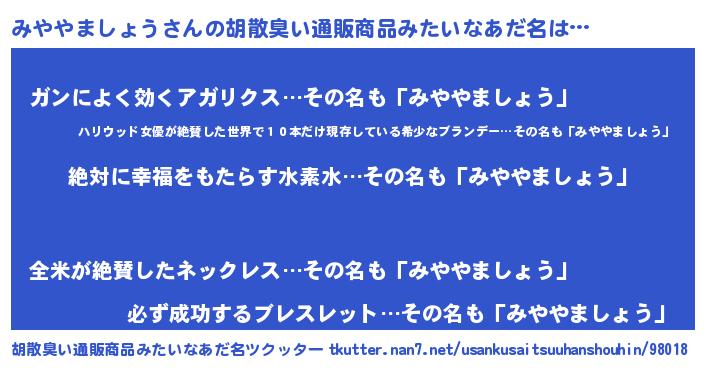 | 男性向けラノベタイトル風あだ名 | 『みややましょうという概念が存在しない退屈な世界 』 |