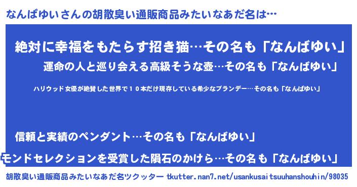 | 意味不明あだ名 | 『住所不定無職なんばゆい(86歳)』 |