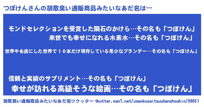| 意味不明あだ名 | 『住所不定無職つぼけん(95歳)』 |