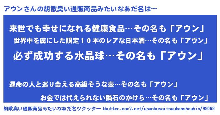 | ヘコむあだ名 | 『アウにゅー』『アウン(笑)』 |