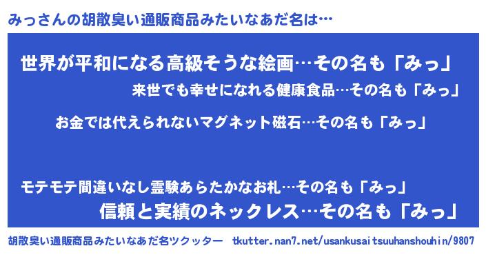 | ヘコむあだ名 | 『なまこ酢』『みっを』『みっ(笑)』 |