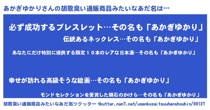 | 男性向けラノベタイトル風あだ名 | 『この素晴らしい世界にあかぎゆかりを!』 |