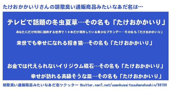 | 伝説のあだ名 | 『古より伝わる吟遊詩人たけおかかいり』 |