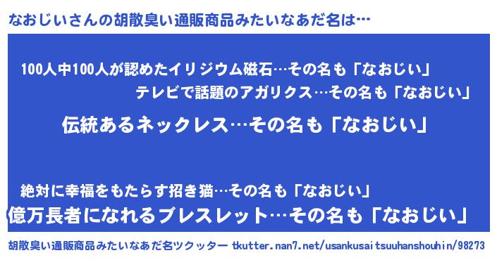 | 男性向けラノベタイトル風あだ名 | 『なおじいの嫁は女の子じゃないと思った?』 |