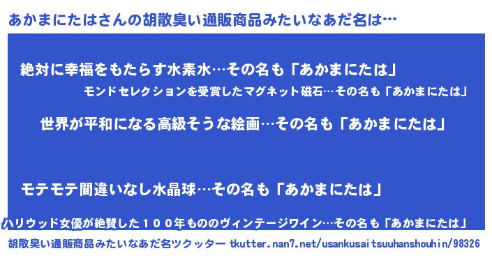 | 男性向けラノベタイトル風あだ名 | 『あかまにたはに滅ぼされるだけの簡単なお仕事です』 |