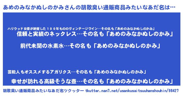 | ヘコむあだ名 | 『あめのみなかぬしのかみ(震え声)』 |