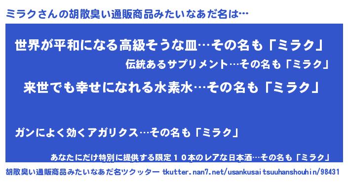 | 欧米人風あだ名 | 『アンジェラ・ミラク』『ウサインミラク』 |