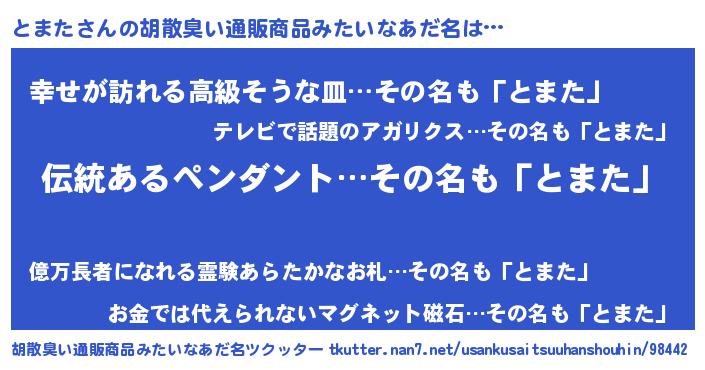 | 意味不明あだ名 | 『とにかく怪しいとまた』『自称とまた』 |