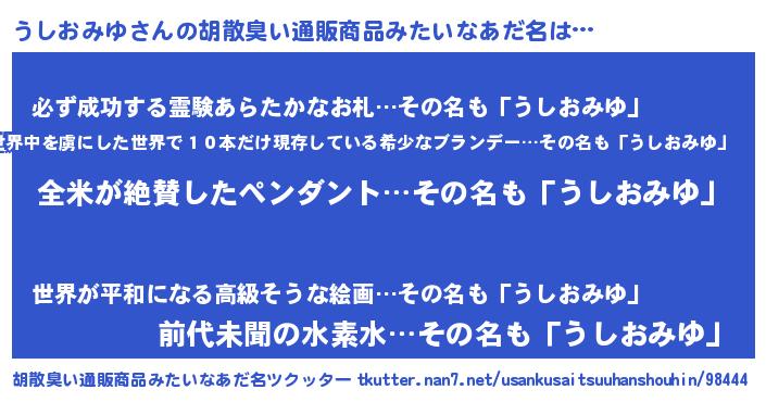 | 男性向けラノベタイトル風あだ名 | 『うしおみゆの嫁は女の子じゃないと思った?』 |