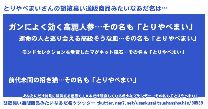 | 肩書あだ名 | 『とりやべまい教授』『とりやべまい大佐』 |