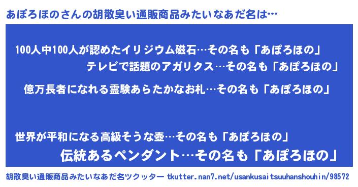 | 意味不明あだ名 | 『ペロリンあぽろほの』『自称あぽろほの』 |