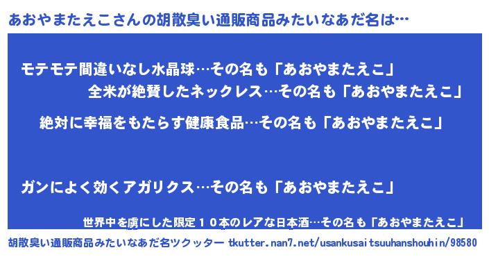 | ヘコむあだ名 | 『あおやまたえこ(笑)』『あおにゅー』 |