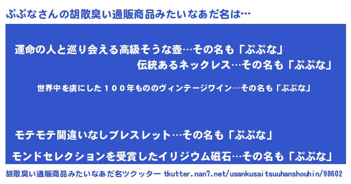 | 男性向けラノベタイトル風あだ名 | 『魔弾の王とぷぷな』『ププナスレイヤー』 |