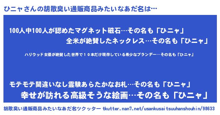 | 意味不明あだ名 | 『住所不定無職ひニャ(89歳)』 |