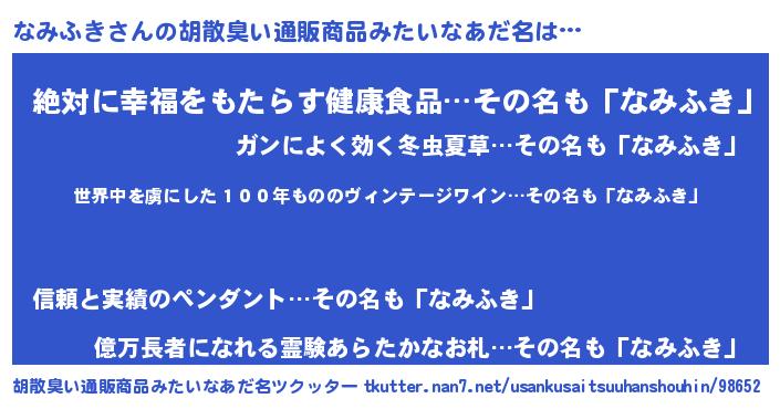 | 男性向けラノベタイトル風あだ名 | 『魔弾の王となみふき』『なみふきの憂鬱』 |