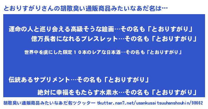 | 意味不明あだ名 | 『住所不定無職とおりすがり(14歳)』 |