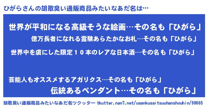 | 意味不明あだ名 | 『住所不定無職ひがら(62歳)』『自称ひがら』 |
