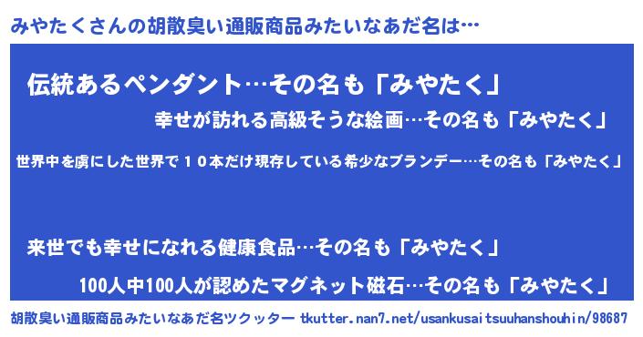 | 意味不明あだ名 | 『住所不定無職みやたく(71歳)』 |