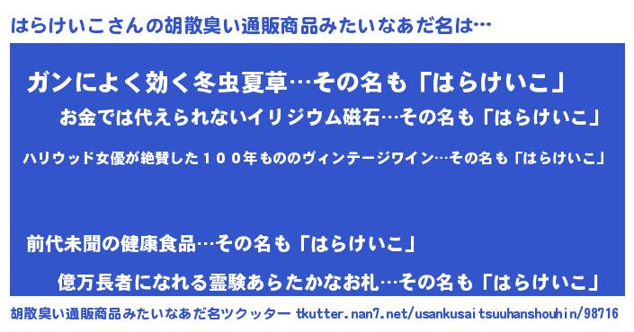 | 意味不明あだ名 | 『住所不定無職はらけいこ(7歳)』 |