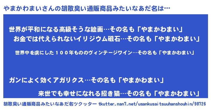 | 意味不明あだ名 | 『住所不定無職やまかわまい(12歳)』 |