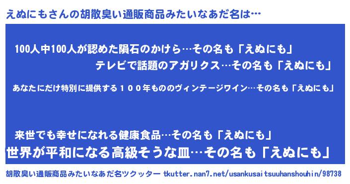 | 意味不明あだ名 | 『住所不定無職えぬにも(10歳)』 |