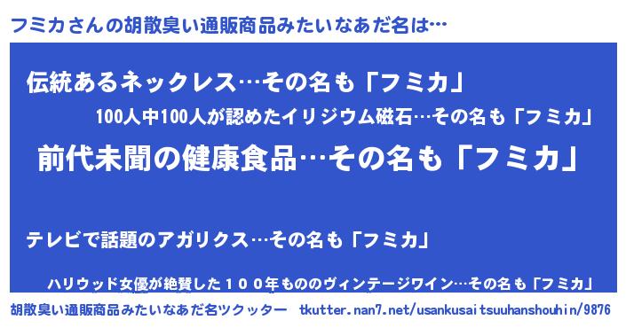 | ヘコむあだ名 | 『フミカ(爆)』『フミっ子』『つくし』 |
