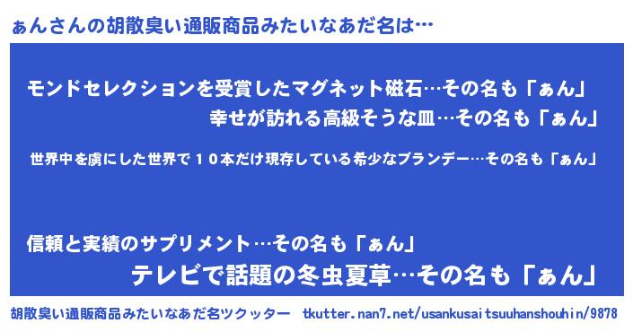 | 意味不明あだ名 | 『住所不定無職ぁん(85歳)』『自称ぁん』 |