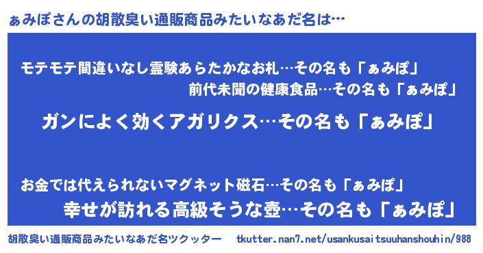 | 意味不明あだ名 | 『自称ぁみぽ』『ペロリンぁみぽ』 |
