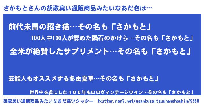 | 男性向けラノベタイトル風あだ名 | 『さかもと~年齢イコール彼女いない歴の魔法使い~』 |