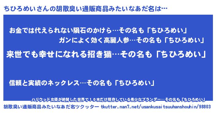 | ヘコむあだ名 | 『ちひろめい(小並感)』『ちひっちょ』 |