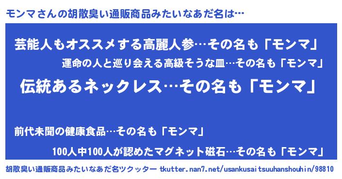 | 男性向けラノベタイトル風あだ名 | 『転生したらモンマだった件』 |