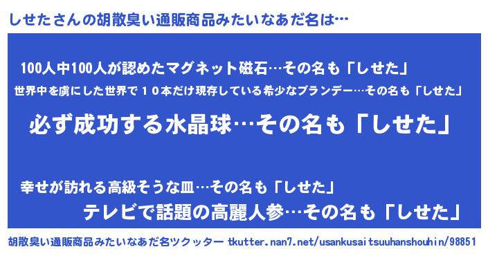 | 欧米人風あだ名 | 『マイケルしせた』『ダニエルしせた』 |