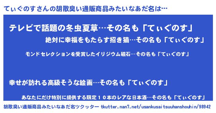 | ヘコむあだ名 | 『てぃぐのす(爆)』『なまこ酢』 |