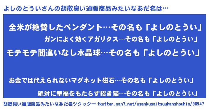 | ヘコむあだ名 | 『よしにゅー』『よし太郎』『つくし』 |