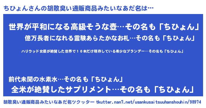 | 意味不明あだ名 | 『住所不定無職ちひょん(77歳)』 |