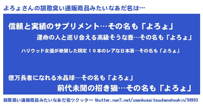 | 男性向けラノベタイトル風あだ名 | 『ヨロョスレイヤー』『魔弾の王とよろょ』 |
