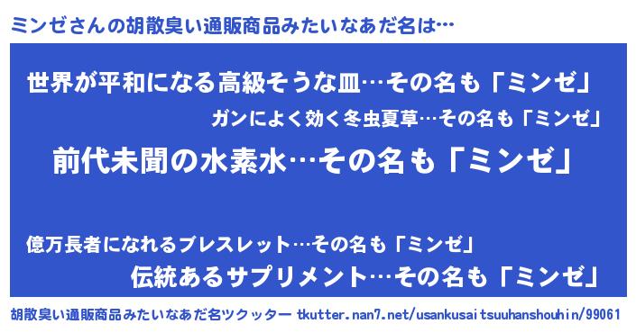 | ヘコむあだ名 | 『ミンゼ(苦笑)』『牛乳』『ミンにー』 |