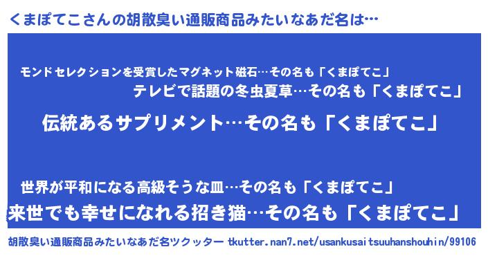 | ヘコむあだ名 | 『くまを』『くまぽてこ(小並感)』 |