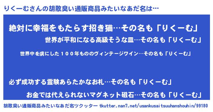 | 男性向けラノベタイトル風あだ名 | 『この素晴らしい世界にりくーむを!』 |