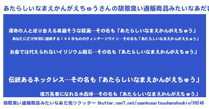 | 男性向けラノベタイトル風あだ名 | 『おまえをオタクにしてやるから、俺をあたらしいなまえかんがえちゅうにしてくれ! 』 |
