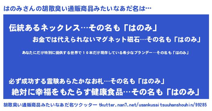| ヘコむあだ名 | 『はのっぺ』『はのみ(苦笑)』『豆乳』 |