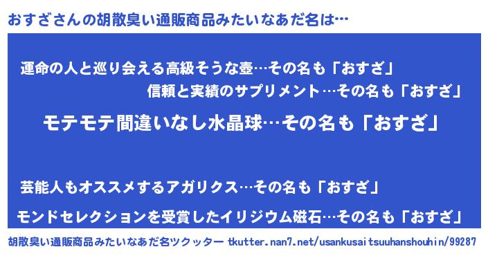 | 男性向けラノベタイトル風あだ名 | 『転生したらおすざだった件』 |