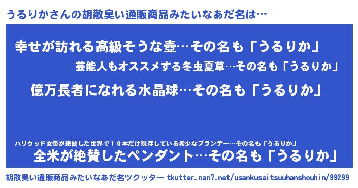 | 男性向けラノベタイトル風あだ名 | 『うるりか~年齢イコール彼女いない歴の魔法使い~』 |