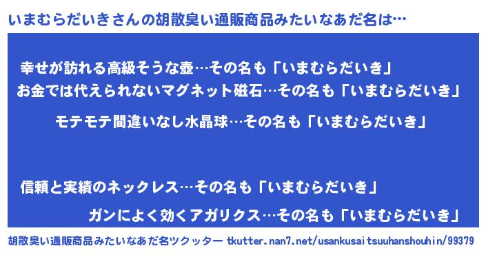 | 男性向けラノベタイトル風あだ名 | 『いまむらだいきの憂鬱』 |