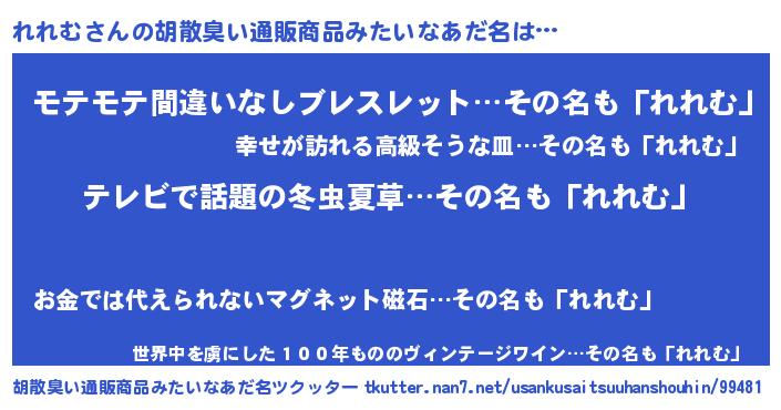 | 意味不明あだ名 | 『なめこ科れれむ属』『自称れれむ』 |