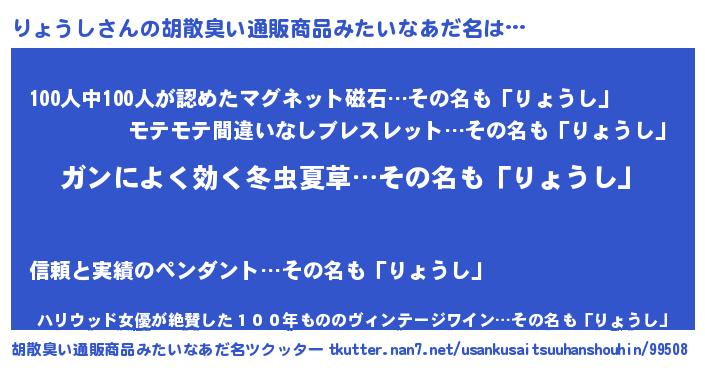 | 意味不明あだ名 | 『自称りょうし』『ペロリンりょうし』 |