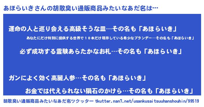 | 男性向けラノベタイトル風あだ名 | 『はたらくあほらいきさま!』 |