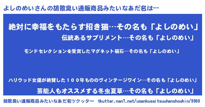 | 男性向けラノベタイトル風あだ名 | 『よしのめいに滅ぼされるだけの簡単なお仕事です』 |