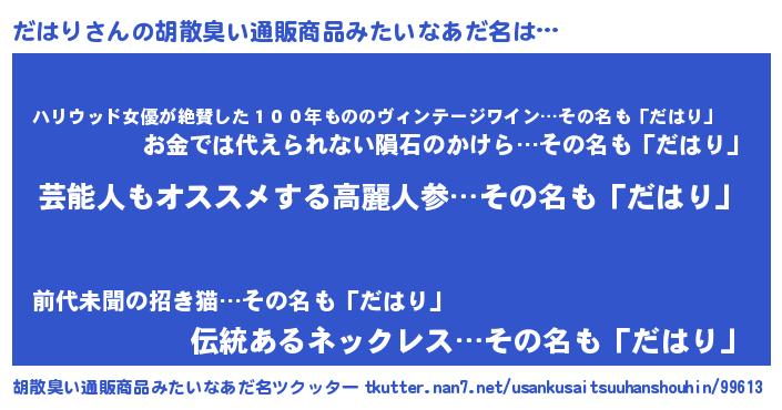 | ヘコむあだ名 | 『だはを』『だはり(笑)』『だはにー』 |
